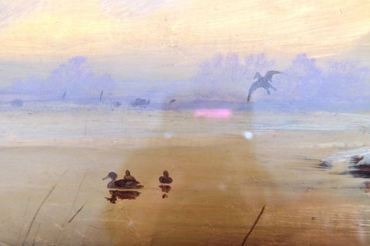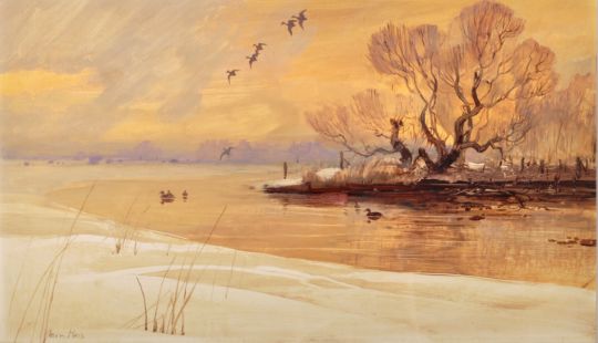Ian Ross - A 20th Century English School oil on paper painting landscape scene with river bank and river featuring ducks on the water and in flight above. Signed by artist to corner, Framed and glazed. Measures approx; 47cm x 63cm.