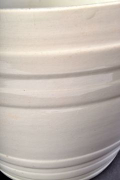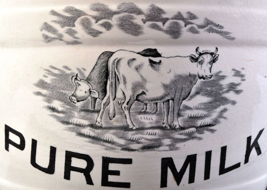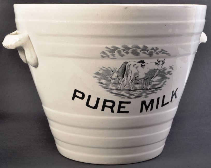 A large 19th Century Victorian Pure Milk staffordshire pottery / ceramic dairy milk pale / pail in white having a conical tapered body with transfer printed pictorial of two dairy cows and bold black text. Twin handes to the sides with ribbed bands to the bucket. Some crazing however appears in good condition with no visible cracks, chips or repair. Uniform age related crazing throughout.. Measures approx; 30cm x 44cm.