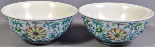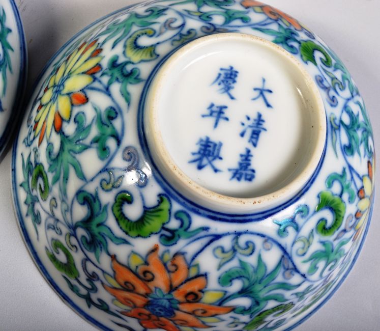A pair of 20th Century Chinese Republic Period Jiaqing mark Oriental porcelain tea bowls / prayer bowls of ogee shape having hand painted botanical decoration depicting scrolling leaves and floral medallions. Raised on a small circular foot. The underside bearing six character Jiaqing (1796-1820) reign mark in underglaze blue Kaishu script. Measures approx; 5cm x 11.5cm. No visible damage.