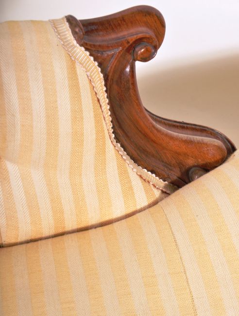 A 19th Century Victorian rosewood chaise longue / day bed. Raised on scroll legs with terminal feet having an overstuffed striped fabric with button backed gallery and arm rest. The chaise longue with scrolled show wood frame. Measures approx 82x182x70cm.