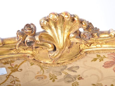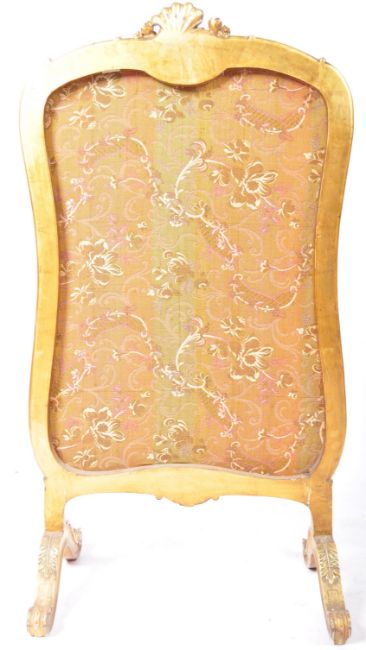 A 19th Century Rococo influence gilt gesso wood firescreen having a carved wooden frame detailed with shells raised on scrolled splayed feet supports. The fire screen with central panel having embroidered floral scrolls and sprays. Measures approx; 106cm x 57cm x 34cm.
