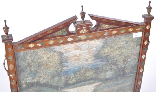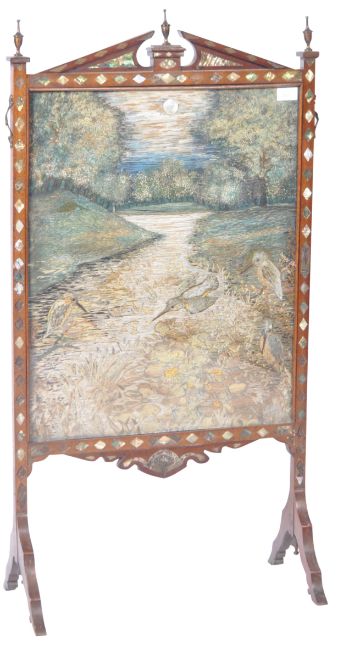 A 19th Century Victorian silk worked fire screen having a mahogany frame with arched pediment top with brass finials and handles to the side and decorative mother of pearl inlay throughout. Charming silk river scene set within with a mother of pearl moon and kingfisher birds to the foreground. All being raised on shaped supports. The screen measures approx; 106cm x 57cm x 27cm.
