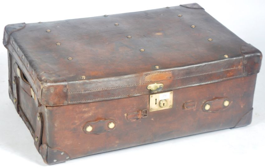 A large 19th Century Victorian leather travel trunk / suitcase having metal studs with brass mounts and central brass Secure Lever lock. Carrying handles to each side and the front with A.D monogram to the centre lid which opens to reveal a hollow interior. Measures approx; 33cm x 84cm x 55cm. Good wear to the leather, sadly the lock is broken.