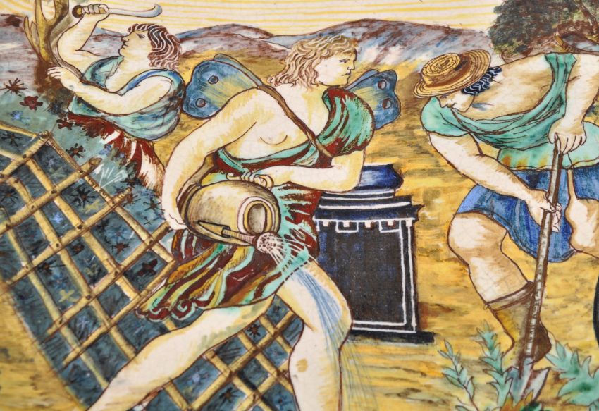 An early 20th Century Italian Renaissance revival Maiolica Majolica tin glazed earthenware charger of large size having hand painted polychrome scenes depicting figures working the land with chariot in the clouds being drawn by two peacocks and putti. Measures approx; 38.5cm. Some minor chips to glaze / rim but no signs of major damage.