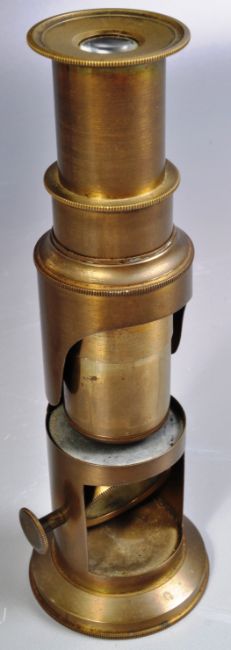A group of 19th Century Victorian Scientific instruments / equipment comprising a large Apothecary glass bottle with stopper, a smaller example along with a miniature brass microscope. Largest measures approx; 22cm tall.