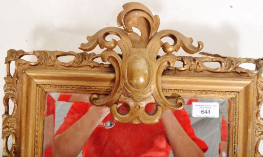 A 19th Century Victorian gilt gesso hanging hall mirror of slender rectangular form having a well worked pierced floral frame with scrolled finial top. Central bevelled edge mirrored panel with brass hanging rail to the verso. Wear commensurate with age mostly to the gilt. Measures approx; 84cm x 42cm.