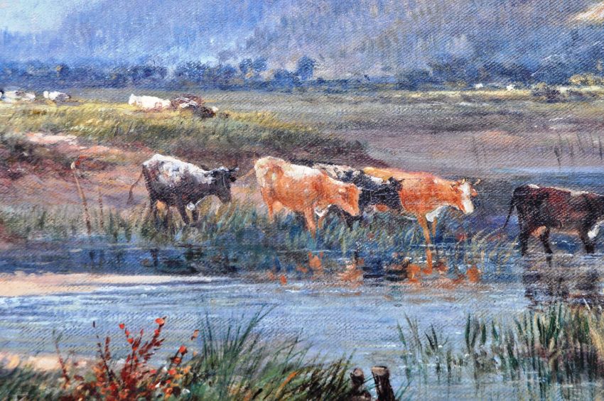 John Syer R.I. (1815-1885) - A large 19th Century Victorian oil on canvas landscape scene painting depicting fishing boat returning with seated figures on fallen tree, cattle grazing the the right of the image with smaller boat & pond. The scene mountainous with rural trees & foliage set under a blue cloudy sky. Housed within a gilded frame (some wear). Measures approx; 102cm x 133cm.