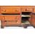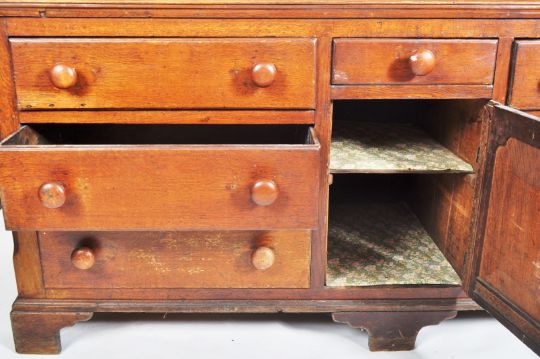 A large 19th Century solid oak dresser base / sideboard credenza of canted end form having panelled sides with thick chamfered edge top. Below a central panelled oak cupboard door with single short drawer above flanked by three banks of drawers having large turned handles. All being raised on  bracket feet supports. Wear commensurate with age mostly to the back panels, overall good. Measures approx; 87cm x 195cm x 57cm.