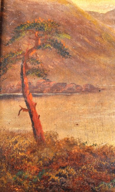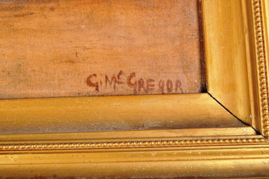 G. McGregor - An early 20th Century oil on board painting landscape painting depicting mountain regions to the backdrop with a large lake and further grass lands. Signed in red by the artist to the bottom right. Set within a gilt frame. Measures approx; 33cm x 55cm.