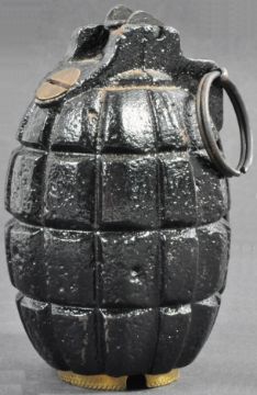 An original WWI First World War British Army inert No. 5 MKI mills bomb / hand grenade. Typical form, being a complete example with pin and firing lever present. The screw in base plug marked No. 5 MKI with 1916 date, broad arrow inspection mark and maker's for Calthorpe Motor Co.