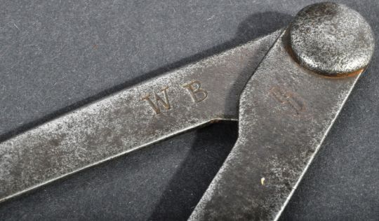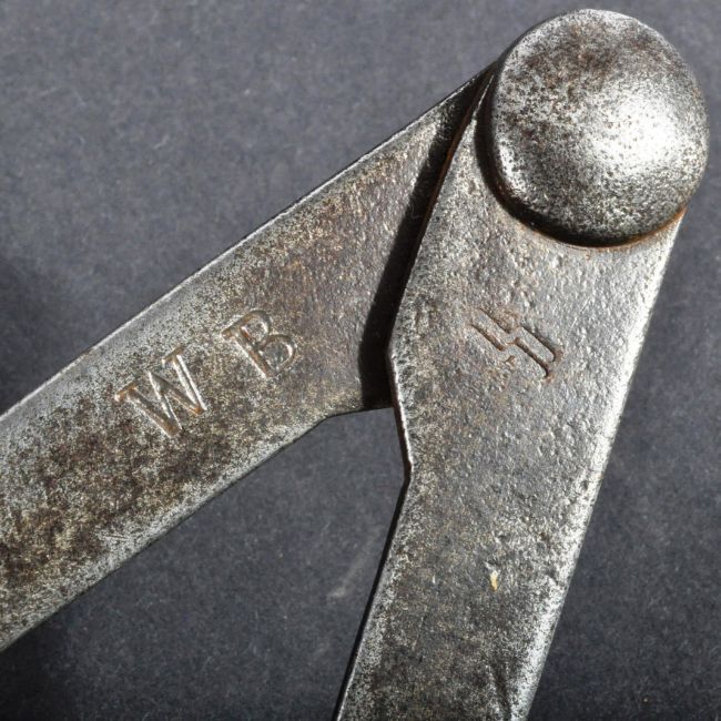 A pair of WWII Second World War Third Reich Nazi German Waffen SS callipers. Two hinged legs with turned-in points, stamped W.B with SS runes to the swing joint. Measures approx 19cm.