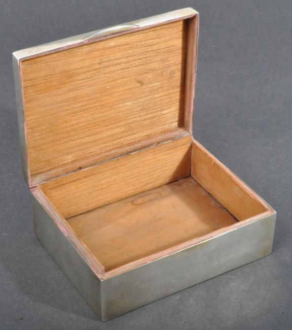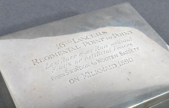 An Edwardian Anglo-Indian War related hallmarked silver presentation cigarette box. Engraved to top ' 16th Lancers - Regimental Point To Point - Last Race ever Run without Flags or Artificial Fences - from Swindon to Wooten Bassett - On Milkmaid - 1890 '. Hallmarks to side for A&J Zimmerman, Birmingham, 1907. Measures approx; 11cm wide. Gross weight; 306g.