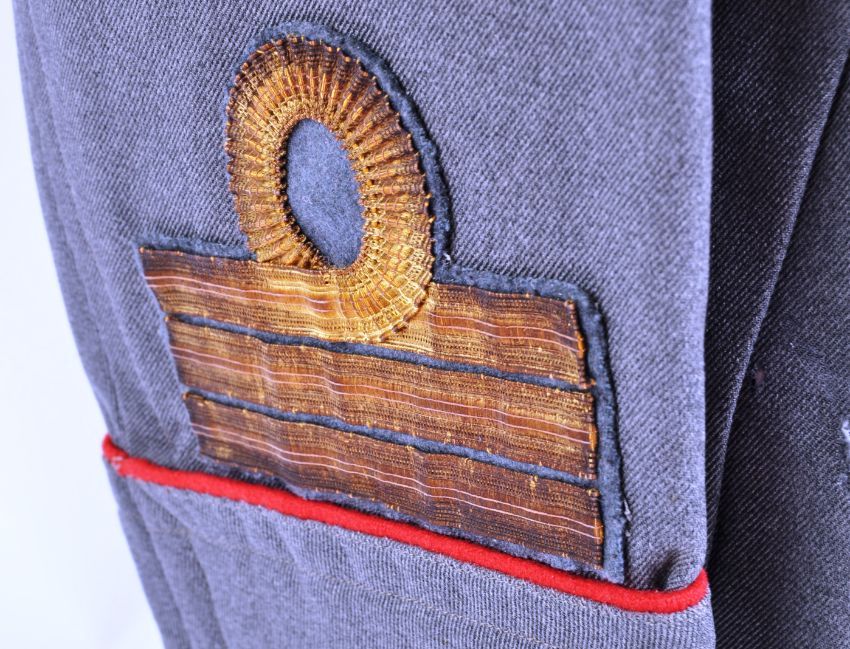 An original WWII Second World War era Italian Army Officer / Infantry Officers uniform comprising dress tunic and trousers. The field grey tunic / jacket bullion Infantry badges to each shoulder epaulette and gorget patches to the black velvet faced collar. Captain rank stripes to each sleeve. Complete matching with uniform trousers.