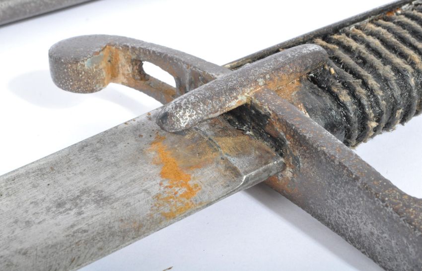 An early 19th Century 1830 pattern German / Saxon Cavalry Troopers sword. Dome shaped pommel with leather and wire bound grip surrounded by a ' D ' shaped knuckle guard hilt. Forward facing quillon and langets fitting tightly over the mouth of the scabbard. Long curved blade housed in steel scabbard with suspension ring. Measures approx 100cm.The sword reputedly found in a German cellar.