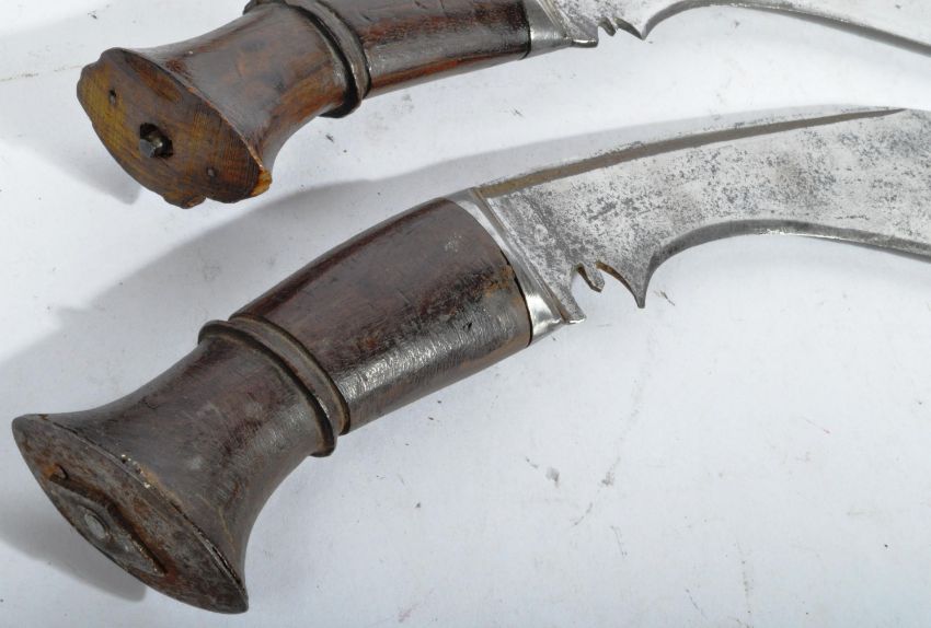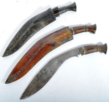 A collection of x3 early 20th Century Nepal / Nepalese Gurkha Kukri knife / daggers. Usual form with wooden and horn handles and curved single edged blades, one with scrollwork engraving. Two housed in leather wrapped scabbards and one retaining the two smaller Karda & Chakmak knives. Largest to measure approx 42cm.