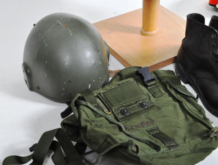 A collection of assorted 20th Century Royal Marines / British Army military uniform items to include x2 GS MK6 combat helmets (x1 with DPM camo covering), a respirator haversack, pair of size 8 leather boots, nylon stable, a peaked parade cap and raincoat. All contained in a green canvas kit bag.