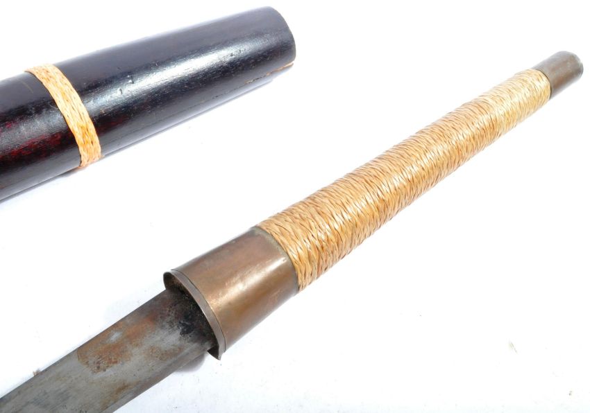 A 20th Century Burmese Dha sword. The sword having a straw bound grip with brass collar and a long gently curved blade. Housed in a wooden scabbard with pointed tip and rope binding. Measures approx 85cm.