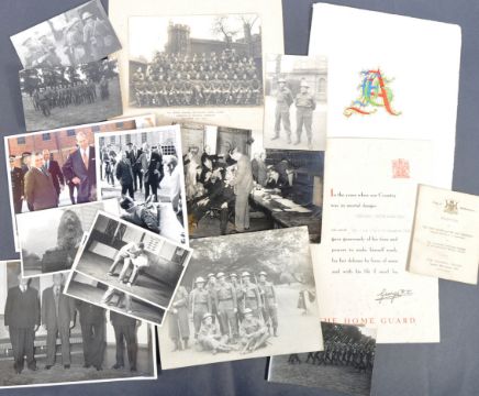 WWII Second World War - effects of Frederick George Alexander, an employee of Huntley & Palmers, and member of their Home Guard Battalion (Reading). Comprising; his Home Guard certificate from King George, 7th Berks (Reading) Battalion Home Guard - Huntley & Palmers Company Dec 3rd 1944, other images of Home Guard parades / inspections, training photographs, and a document given to him upon his retirement from H&P.