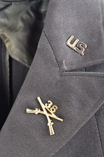 An original 20th Century US United States Army Officers Captain uniform tunic. The dark olive jacket with belted waist having white metal Captains rank badge to each shoulder and x2 Infantry regiment badges to the front collars. A (loose) Sixth United States Army patch to the left arm.