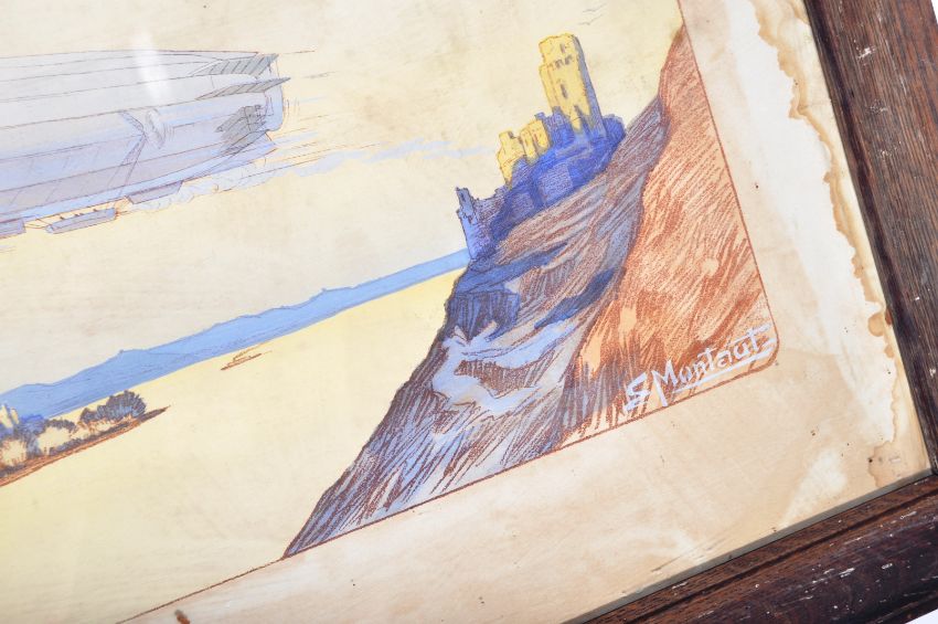 Ernest Montaut - Airship Over Scottish Loch - early 20th century lithograph print with over painted details. Signed to the corner ' E. Montaut '. Herons and the airship extending past the lithograph border. Framed in a period oak frame. Total size approx; 54cm x 100cm