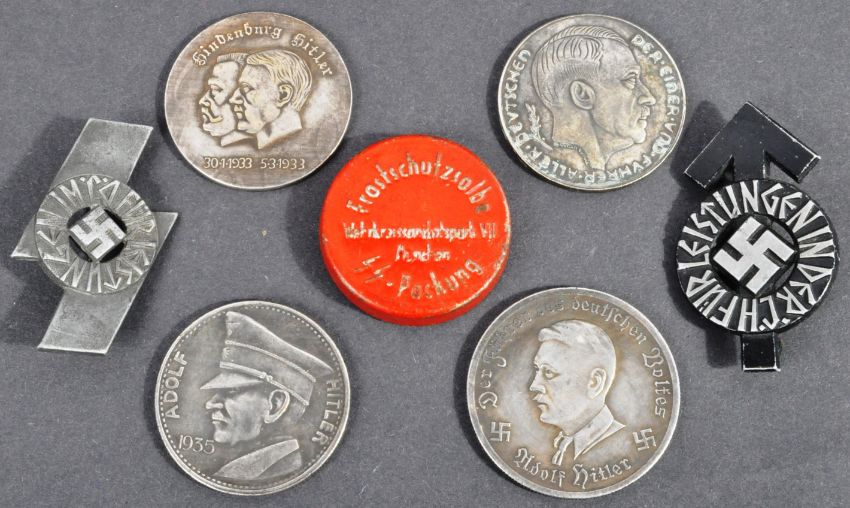 A collection of assorted WWII Second World War interest Third Reich Nazi German items. The collection to include a red Waffen SS anti frostbite / lip balm canister, x2 Hitler Youth Proficiency badges depicting a central Swastika surrounded a runic-style script and x4 Adolf Hitler commemorative coin medallions.