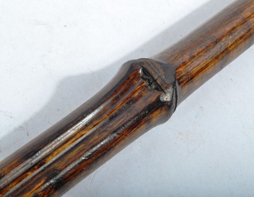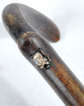 A 19th Century Victorian gentleman's Masonic sword stick / walking cane with concealed blade. The cane having a hooked wooden grip with death skull enamel badge to the front. A small brass press stud releases the diamond section blade. Housed in a hardwood / bamboo shaft. Measures approx 89cm.