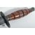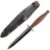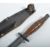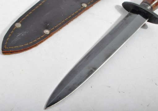 A mid 20th Century FS Fairbairn Sykes commando knife. A variation type with ribbed wooden handle and steel capped pommel. The cross guard marked to the underside ' Japan ' (possibly used by US Special Forces in Far East operations) leading to the ebonised steel blade. Housed in a brown leather scabbard. Measures approx 28cm.