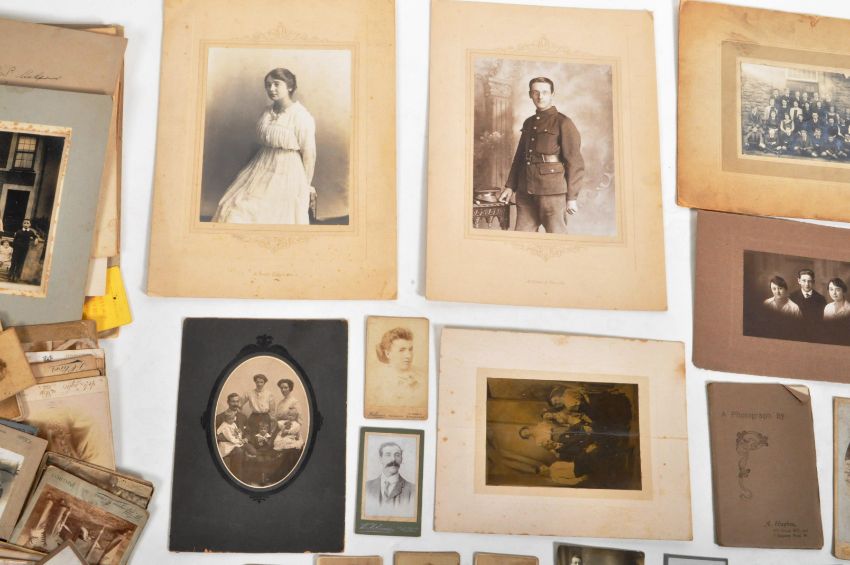 A collection of 19th Century Victorian to WWI First World War period carte de visite and cabinet photographs. All presumably related to the same family, many appearing to be Welsh in origin (or similar surrounding area). Includes one regimental WW1 photograph, others of several family members or single family members. x1 box full.