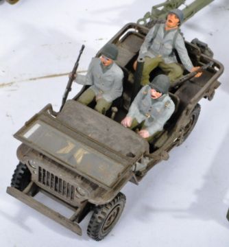 A collection of x12 vintage believed 1/35 scale WWII Second World War US United States Army plastic model tanks, armoured vehicles and field guns. Examples to include military tractors, armoured lorries, jeeps, artillery field guns and others. All made and painted to a high standard and generally appearing complete - some minor accessories may be missing. Highly detailed.
