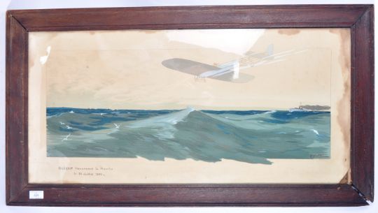 Ernest Montaut - Bleriot Traversant La Manche Le 25 Juillet 1909 (Bleriot Crossing The English Channel July 25, 1909) - early 20th century lithograph print with over painted details. Signed to the corner ' E. Montaul ', with printed French title to other corner and copyright date of 1909, Paris. Framed in a period oak frame (AF). Total size approx; 54cm x 100cmEarly in the morning of July 25th, 1909 - a hundred years ago today - Louis Blériot (1872-1936) crossed the English Channel, a distance of 22 statute miles (36.6 km) from Les Barraques (near Calais) to Dover. There had been longer flights and further flights, but the conquest of the Channel by air was a sensation and brought Blériot instant fame.