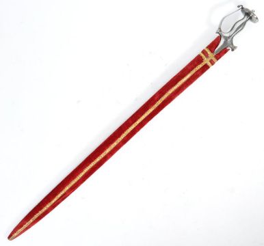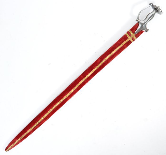 A 19th century Indian Kirach / Tulwar ( Talwaar / Talwar ) sword. The sword (likely Bikaner Army) has a polished metal hilt with disc pommel and scroll quillon. The single straight edge fullered blade housed in its original red velvet wrapped wooden scabbard. Measures approx 91cm.