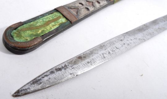 A 19th century Sudanese / African Tuareg Gozma tribal arm dagger. Tri-tipped pommel in brass, leading to a double edged blade. Housed in a decorative leather tool worked scabbard, with aluminium engraved panel work, and a hooped leather arm support. Total length approx; 57cm long.