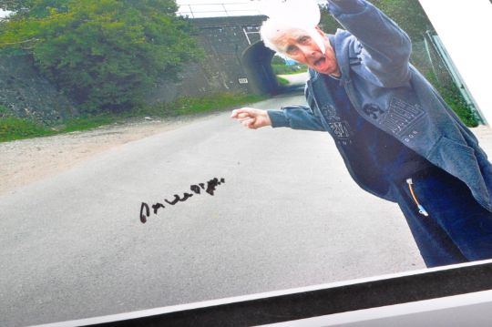 The Great Train Robbery - Ronnie Biggs (1929-2013) - a collection of x4 autographed A4 (and similar size) humorous photographs, self-printed by Biggs. Includes; a double-signed 'Doing Time' photograph, one captioned 'Fuck 'Em All', another 'Do I Look Like I'm Sorry?', and a photograph of Biggs alongside a naked female 'Never Mind The Quality, Feel The Width!'. All signed in black ink, undedicated. Obtained personally by the vendor.