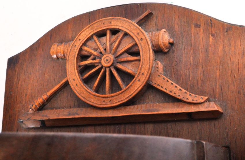 A WWII Second World War Royal Artillery trench art dinner gong. The gong constructed from a 25 Pounder artillery field gun shell case, engraved to the front with the Royal Artillery emblem and two enamel formation flashes for the 138th City Of London Field Regiment. Suspended on a wooden plaque with further wooden regimental engravings to the top. Measures approx 43x14cm.