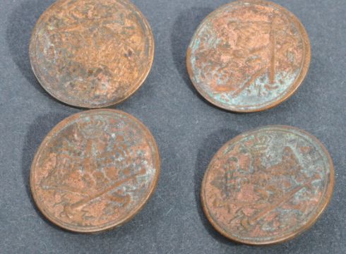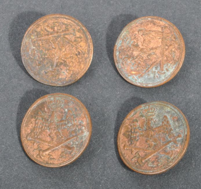 A collection of x4 original early 19th Century Napoleonic War period Imperial Guards tunic uniform buttons. The buttons faintly depicting the French Imperial Eagle resting on two crossed cannons beneath a crown. Each to measure approx 1.5cm.