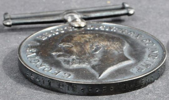 A WWI First World War medal pair awarded to one 55411 Private E. E. Miller of the Essex Regiment. Comprising War Medal and Victory Medal. No ribbons.