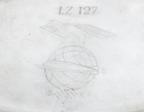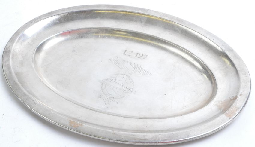 LZ 127 Graf Zeppelin - a scarce original c1930s silver plate oval dish, believed to be from LZ 127. Maker's marks to bottom for S. Siffring, WMF. The bowl in engraved with an Imperial Nazi eagle atop a swastika, with the Zeppelin Globe motif and marked ' DRZ '. Above this is engraved ' LZ 127 '. The plate measures approx; 33cm diameter.