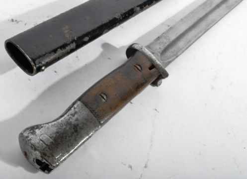 An original WWI First World War Imperial German  SG 84/98 rifle bayonet. Having wooden grips and short steel pommel. Impressed number to ricasso ' 255594'. Fullered single edged blade. Within its original steel scabbard. Measures approx; 40cm overall.