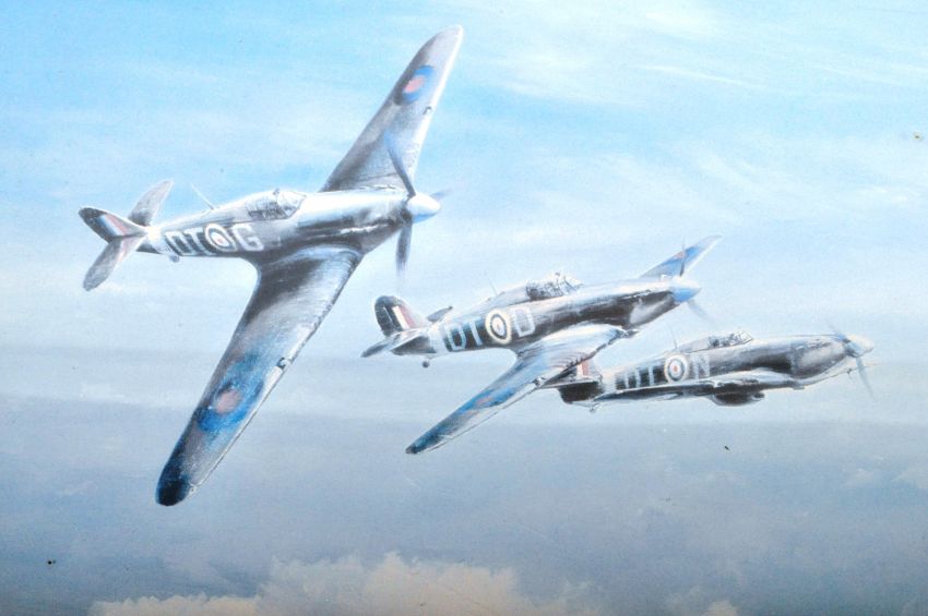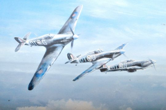 WWII Second World War - a pair of Robert Taylor prints, entitled 'Hurricane' & ' Spitfire'. Hurricane signed by WWII Ace Bob Stanford Tuck, the other signed by Douglas Bader and Johnnie Johnson. Framed. Total sizes approx; 52cm x 61cm.