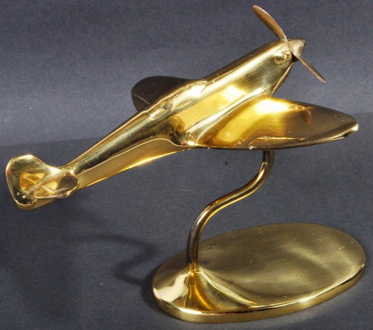 A vintage 20th century brass WWII Second World War desktop model of a RAF Royal Air Force Spitfire aeroplane / plane. Moving propeller, detailed cockpit, mounted on a shaped brass arm, with an oval base. 16cm tall.