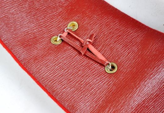 A 20th Century Royal Irish Regiment military drum belt sash. The sash of red leather construction faced with black cloth and edged with gold and scarlet trim. Gold bullion embroidered Royal cipher, Queens crown and ' The Royal Irish Regiment ' between two silver mounted miniature drum sticks.
