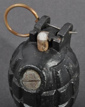 An original WWII Second World War British Army issue mills bomb hand grenade. Inert, but a complete example with with pin, lever, zinc central tube and original screw-in cap to base. Base marked No 36 MK1 with makers Kenrick & Sons and 44 date.
