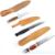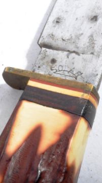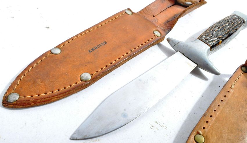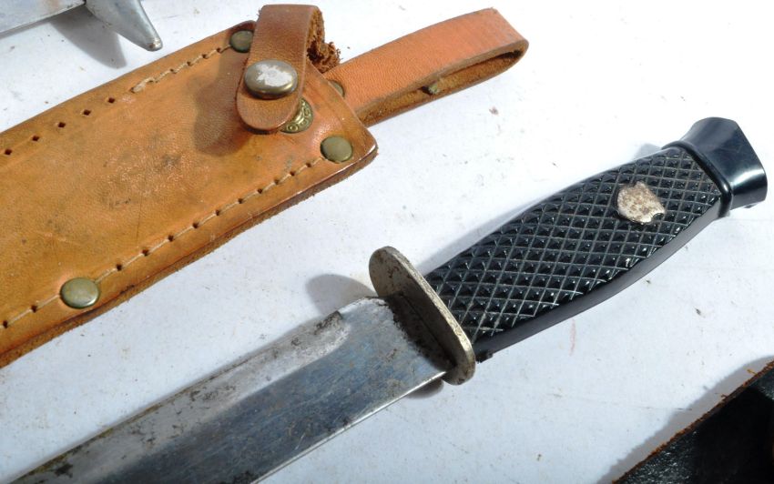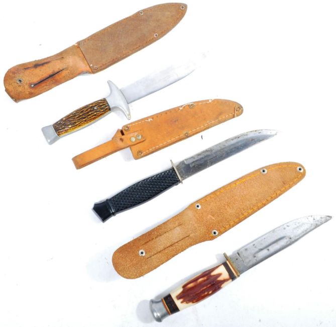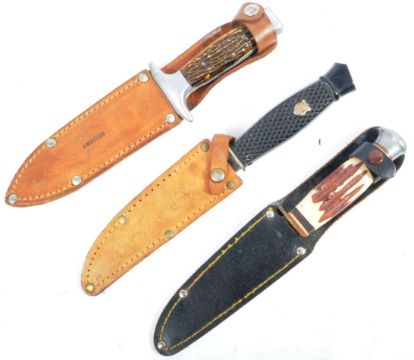 A collection of x3 vintage 20th century hunting daggers / knives. includes; a faux horn-handled ' Solar ' knife, a post-WWII Second World War Solingen knife with black grips, and an aluminium faux horn handled ' Amboise ' knife. All housed in their original leather scabbards. Longest approx; 24cm long.