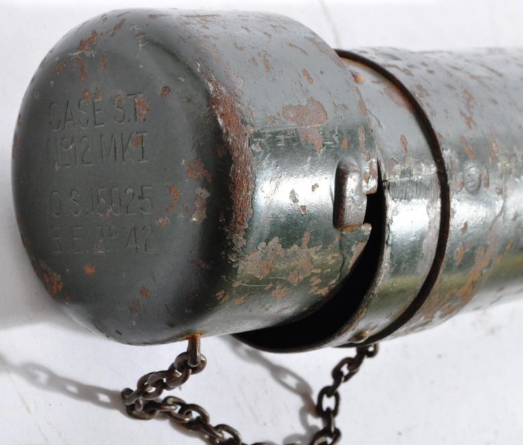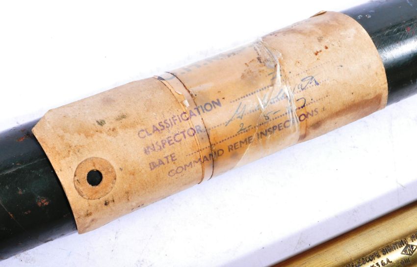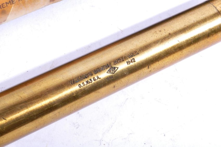 An original WWII Second World War British Army ' Telescope Sighting No. 22C Mk II ' gun sighting scope. Dated 1942. Brass construction. Lenses appear in good working order. Housed in its original green tin (also dated 1942 to cap), with a post-war OHMS inspection label present. Measures approx; 37cm long.