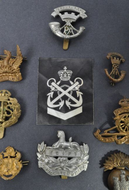Cap Badges - a collection of WWI First & WWII Second World War related British Army uniform cap badges. Comprising: Royal Artillery, ATS, Somerset Light Infantry, Gloucestershire Regiment, Pioneer Corps Badge, and others.