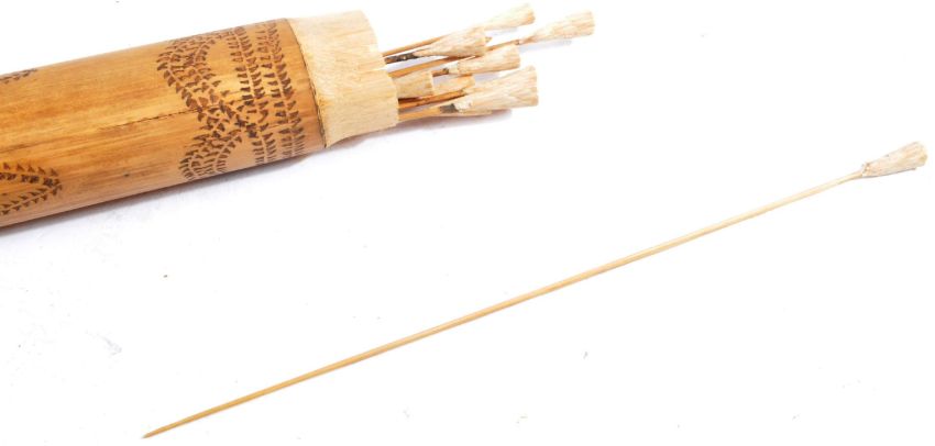 A 20th Century Malaysian bamboo tribal blowpipe with quiver (tolor) and darts. Cylindrical hallow bamboo construction that fits snugly inside the outer sheath. Decorated with pokerwork detailing. Measures approx 100cm.