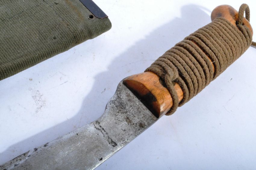 An original vintage British Army issue 1981 dated machete / golok / bush knife. Rope bound wooden grip and the machete blade marked ' Made In England ' with a broad arrow and 1981 makers mark to opposite side. Housed in an associated canvas scabbard dated 1979. Measures approx 46cm.