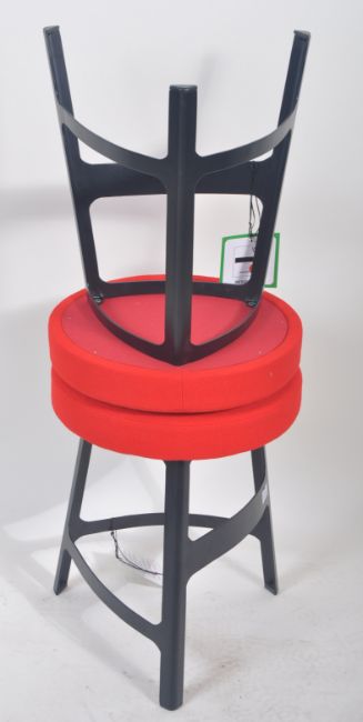 Sean Dix - A pair of contemporary 21st Century dressing table / side stools having red cushion circular tops raised on triform black metal leg frames. Measures approx; 46cm x 38cm.
