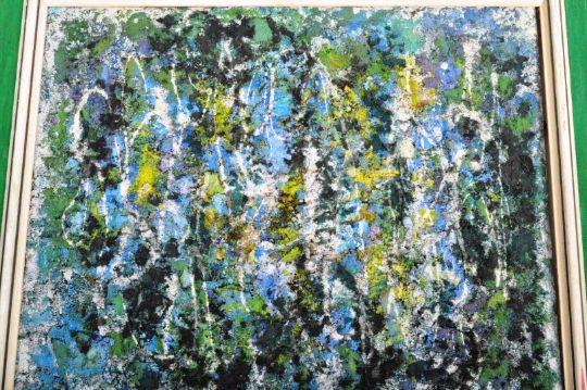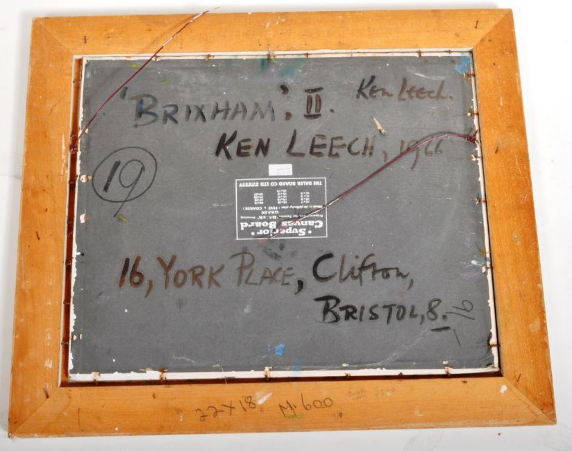 Kenneth ' Ken ' Leech (1915-1990) - Brixham II - An original 1960's retro vintage modernist oil on board painting. Painted in textured relief with green ground and strands of yellow, purple and blues. Signed and notated to verso. Set within a 60's frame. Measures approx; 59cm x 69cm.