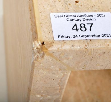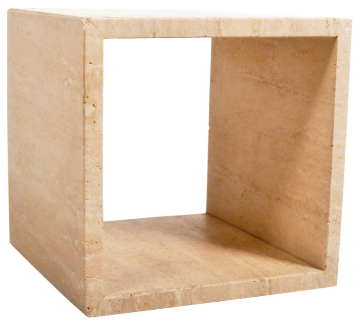 A contemporary Italian travertine stone side lamp / occasional cube table of simple form having chamfered edges with polished sides and interior. Overall good condition, minor wear to the edges. Measures approx; 38cm x 39cm x 40cm.